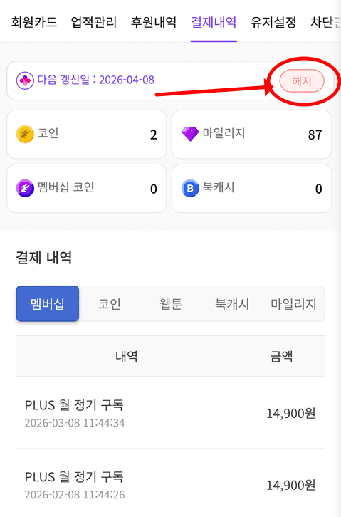 결제내역 탭을 누른 뒤, 곧바로 보이는 해지 버튼을 누르면 끝이다.