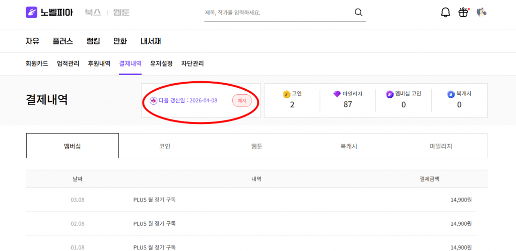 노벨피아 플러스 멤버십 해지 방법