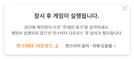 ② 한게임을 여시겠습니까? 라는 멘트가 나오면 열기 버튼을 눌러주시면 됩니다. 만약, 한스타터가 다운로드가 되어 있지 않았다면 한스타터부터 다운로드 하면 됩니다.